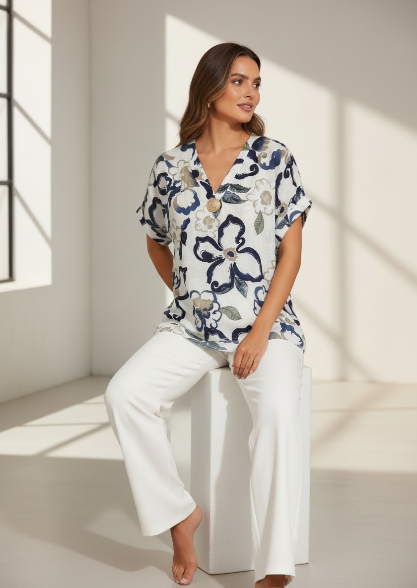 Onesize καλύπτει έως L Μπλούζα ελαστική με φραμπαλά στο μανίκι, με σούρα στο μπροστινό μέρος. Συνδυάζεται εύκολα για να ολοκληρώσετε το καλοκαιρινό σας outfit.