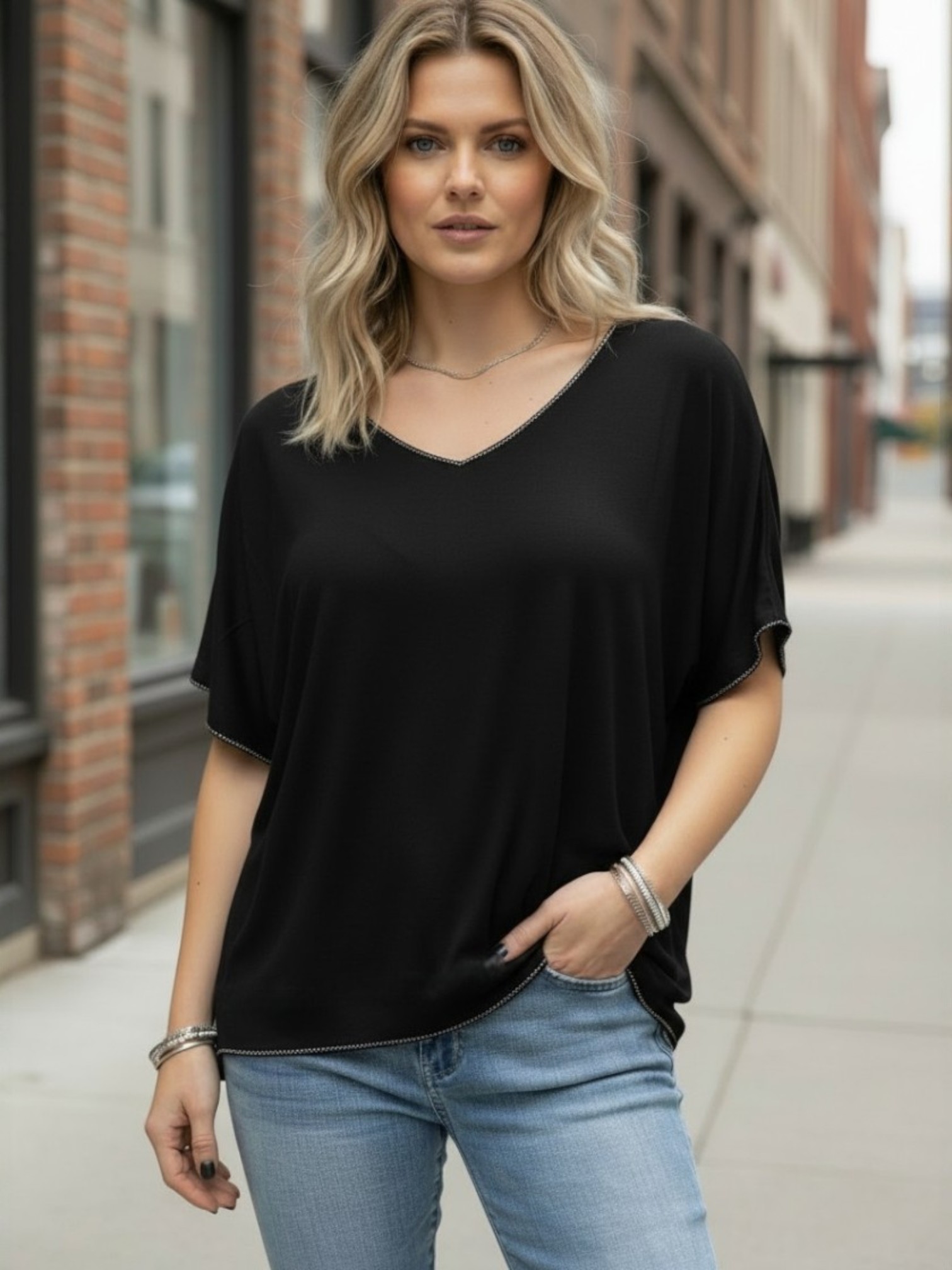Η χαλαρή, άνετη γραμμή της κολακεύει κάθε σιλουέτα, ενώ το V ντεκολτέ προσθέτει μια θηλυκή και κομψή πινελιά. Τα τελειώματα με διακριτική ασημί κλωστή δίνουν μια λάμψη που αναβαθμίζει το look χωρίς υπερβολές 💕