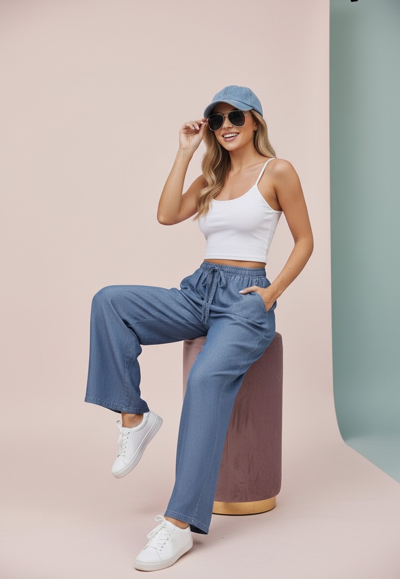 Παντελόνα τζιν από 100% βαμβάκι, ιδανική για άνετες και δροσερές καλοκαιρινές εμφανίσεις. Κατασκευασμένη από λεπτό και αέρινο τζιν ύφασμα, προσφέρει μοναδική αίσθηση δροσιάς και ελευθερία κινήσεων όλη μέρα.
