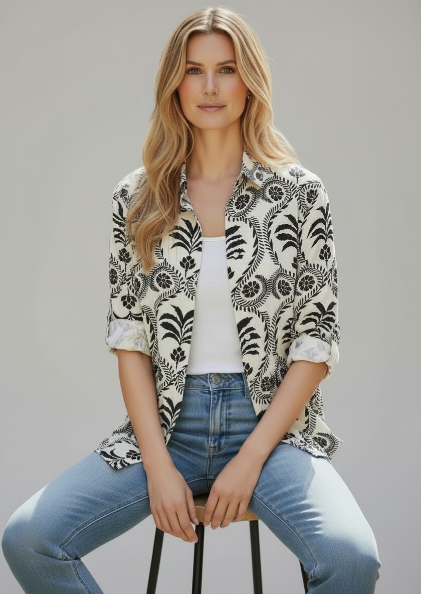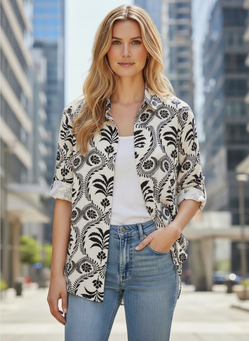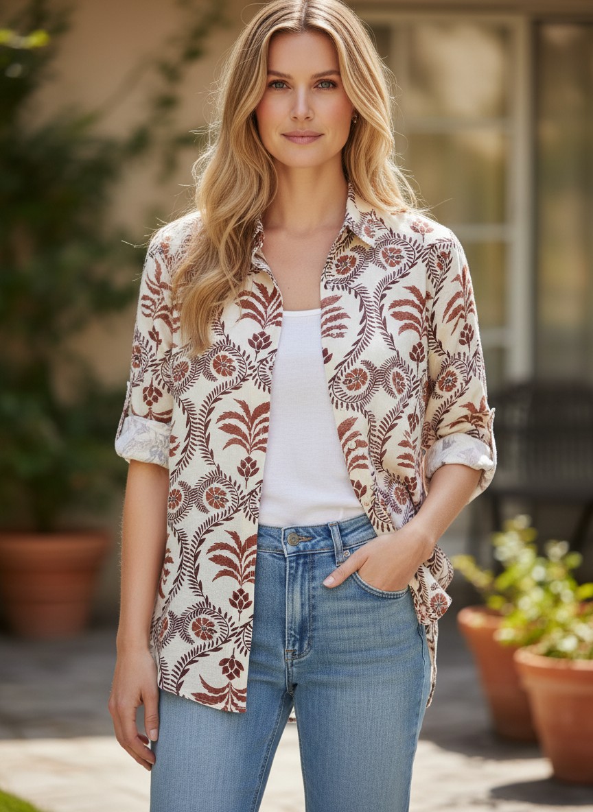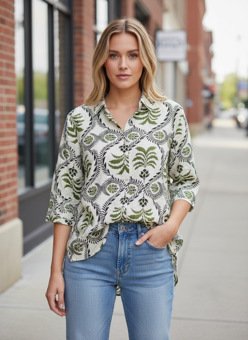 Ανανεώστε την ανοιξιάτικη γκαρνταρόμπα σας με αυτό το κομψό λινό πουκάμισο με όμορφο print. Το ελαφρύ και δροσερό ύφασμά του το κάνει ιδανικό για τις ανοιξιάτικες ημέρες, προσφέροντας άνεση και ευχάριστη εφαρμογή από το πρωί έως το βράδυ.