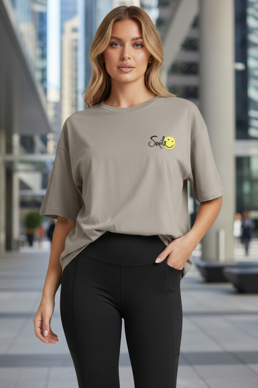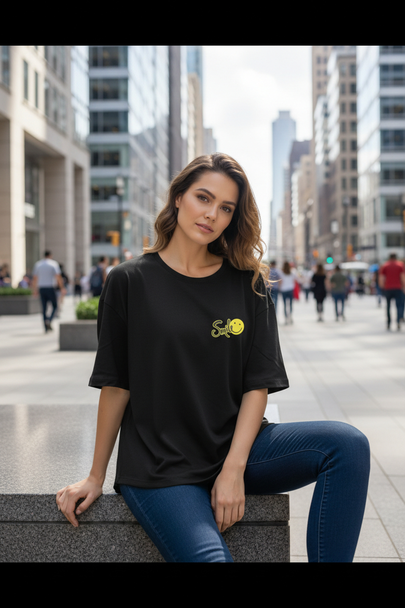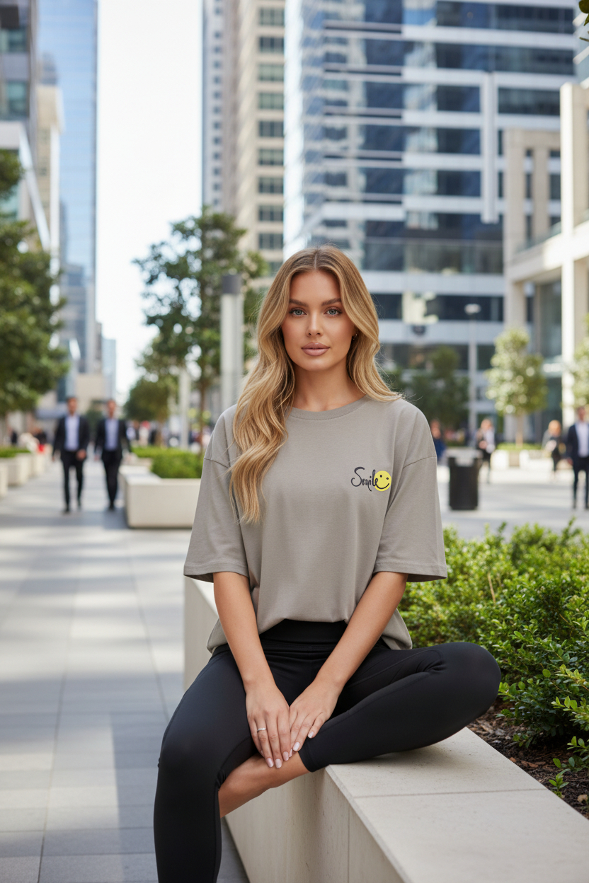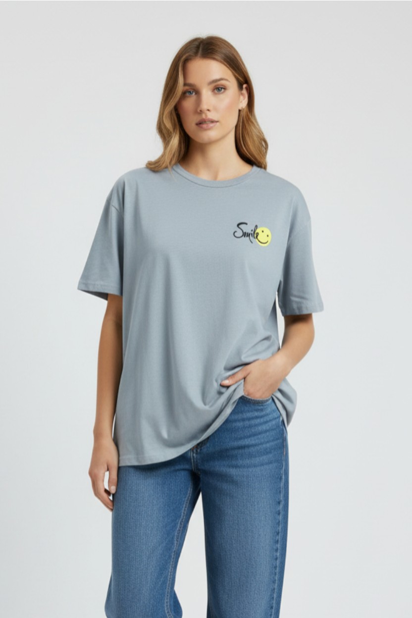 Ένα oversized T-shirt που αποπνέει θετική διάθεση και ανεπιτήδευτο στυλ.