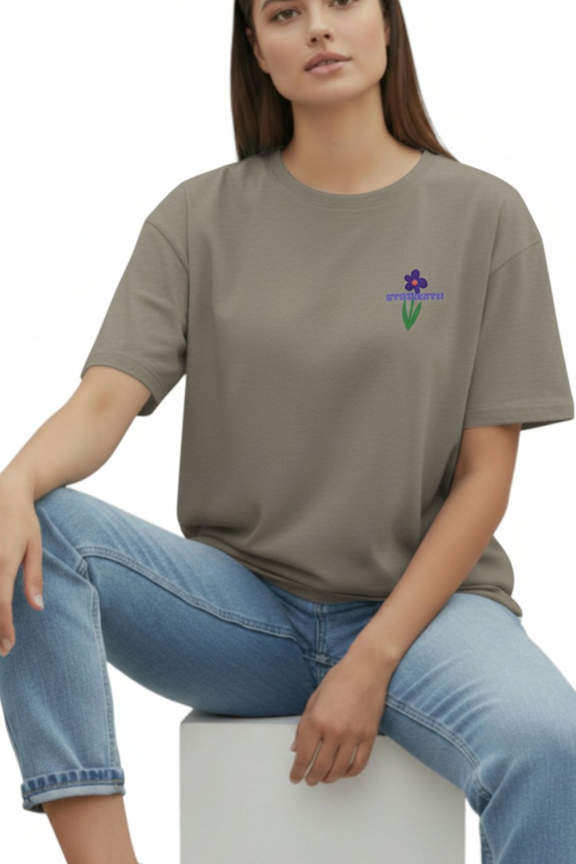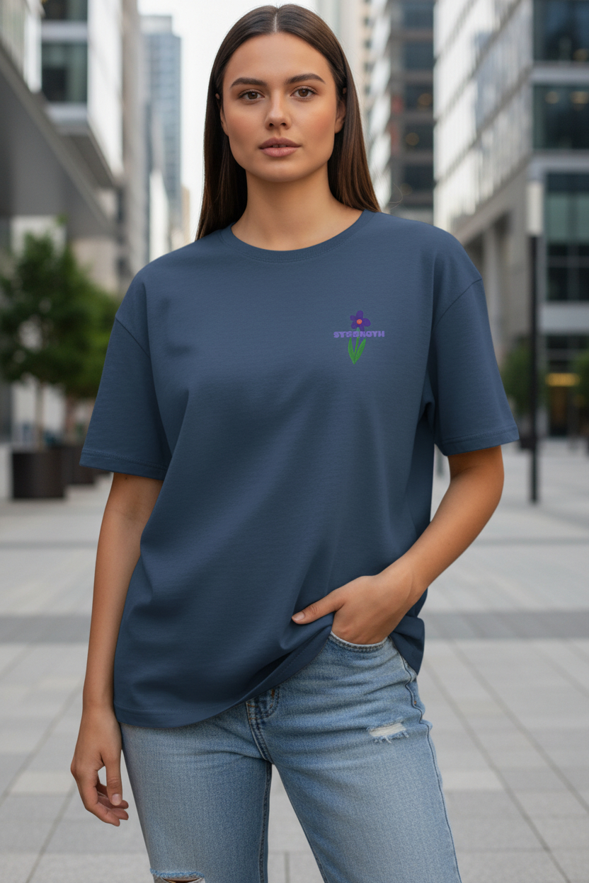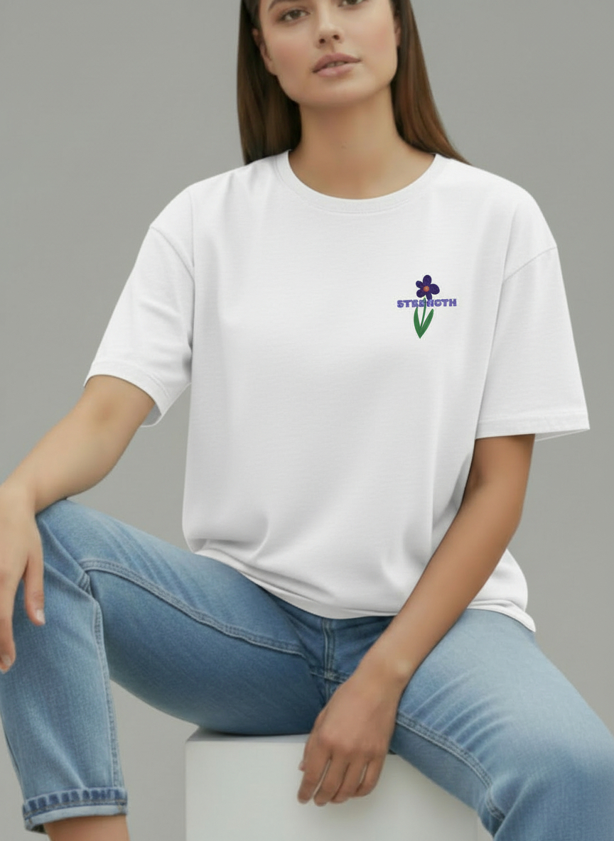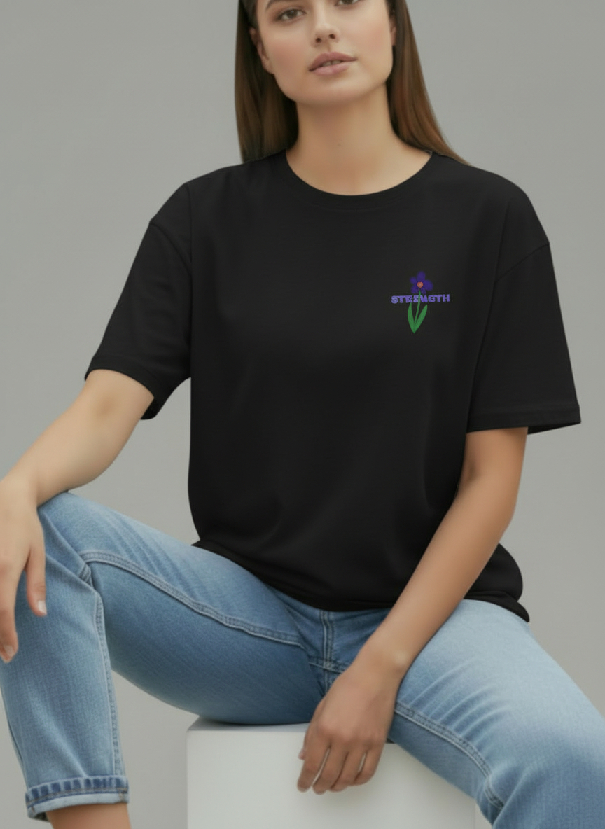 Το μπροστινό τύπωμα “Strength” συνοδεύεται από ένα κομψό λουλούδι, δημιουργώντας ένα look που συνδυάζει αισιοδοξία και στιλιστική λεπτότητα.